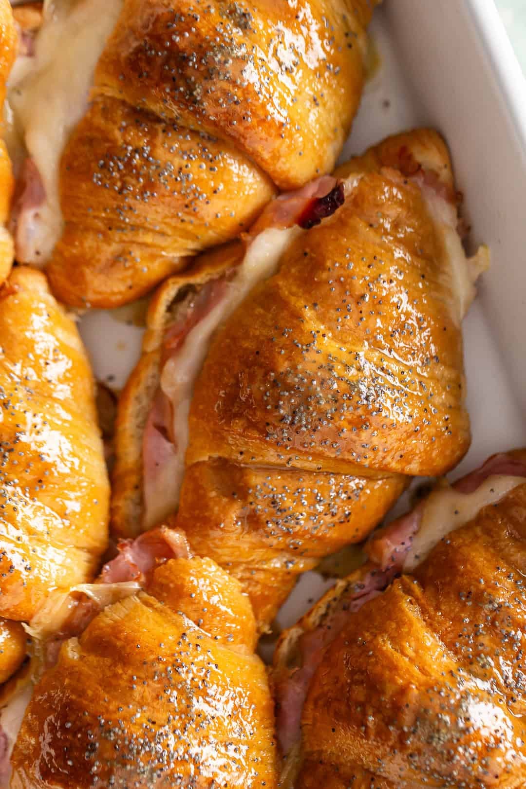 These Hot Ham and Cheese Croissant Sandwiches are buttery, melty, a little sweet, a little savory, and hard to resist. Flaky croissants are filled with smoky ham and Swiss cheese, then brushed with a warm Dijon–honey butter glaze that soaks into the tops. After baking, they are golden, shiny, and gooey inside.